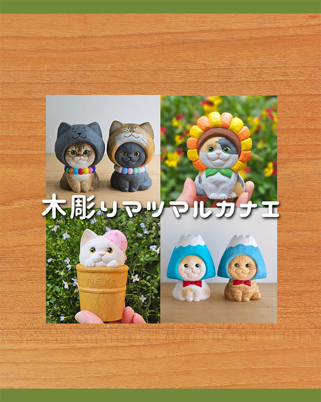 かぶりものをした猫ちゃんや動物たちの、思わずクスッと笑える木彫り作品を制作されている作家さんです。