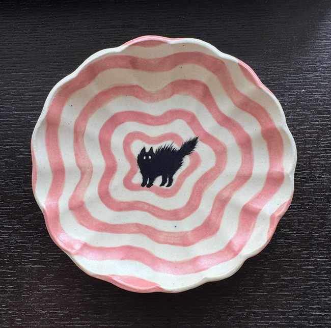 一枚一枚手描きで仕上げられた、不穏さとかわいさが同居する独特な模様のお皿が並びます。