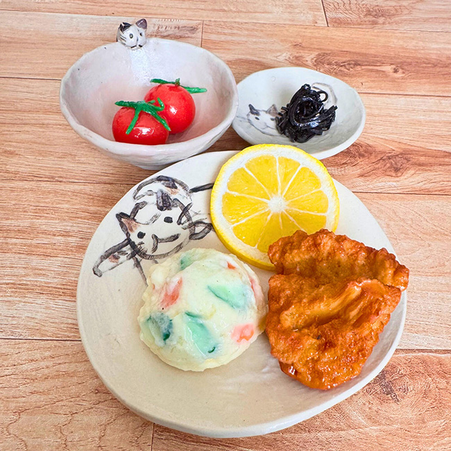 ゆるっとしたタッチの猫又が踊るマグカップやお皿など、遊び心あふれる器も魅力。