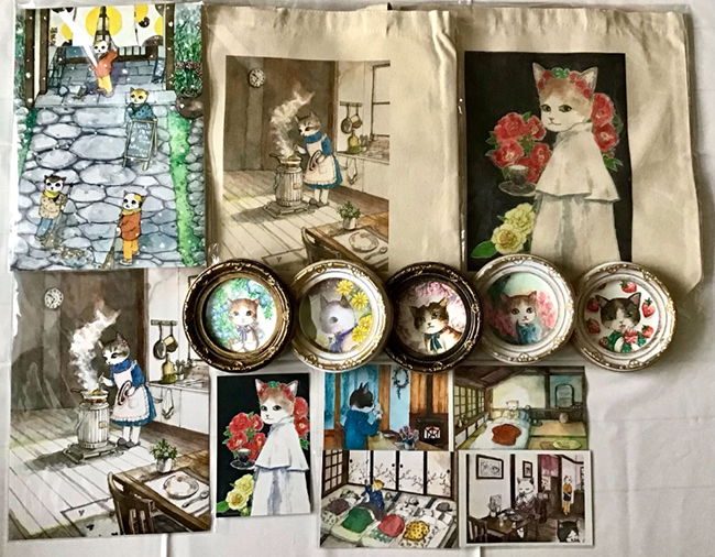 トートバッグやポストカード、ポスターなどのグッズに加え、一点物の水彩画も並びます。